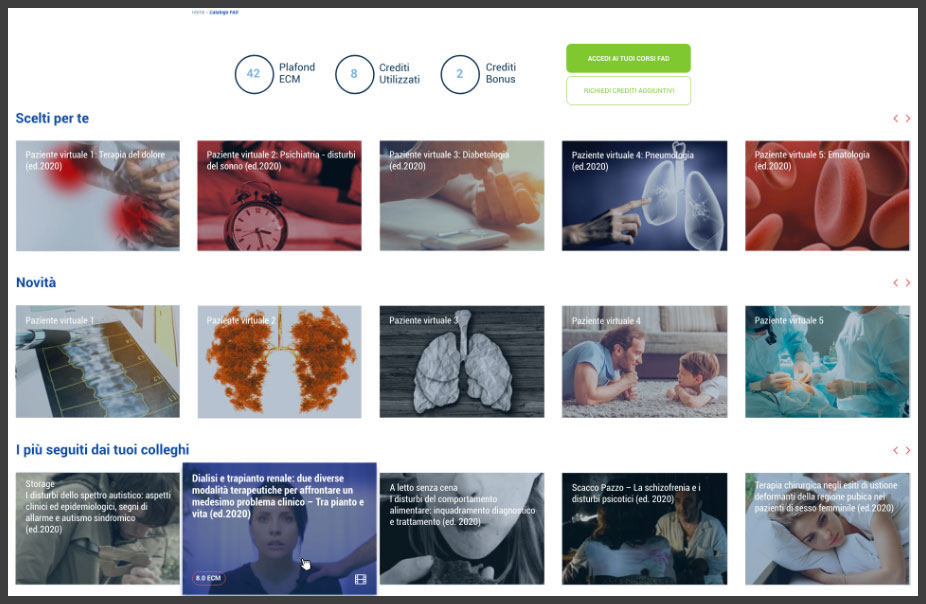 Ecco perché, grazie alla nostra piattaforma FAD, è possibile conseguire tutti gli ECM di cui hai bisogno per metterti in regola con l’obbligo previsto dalla legge. A tua disposizione il catalogo FAD più ricco del web con oltre 200 corsi divisi in cinque collane tematiche – Medicina, Lingue, Manageriale, Sicurezza, Legale – e quattro modelli formativi: ebook, film formazione, corsi interattivi, corsi multimediali. Sappiamo infatti quanto il corretto approccio possa fare la differenza; per questo abbiamo voluto rendere la tua esperienza quanto più stimolante ed innovativa.
